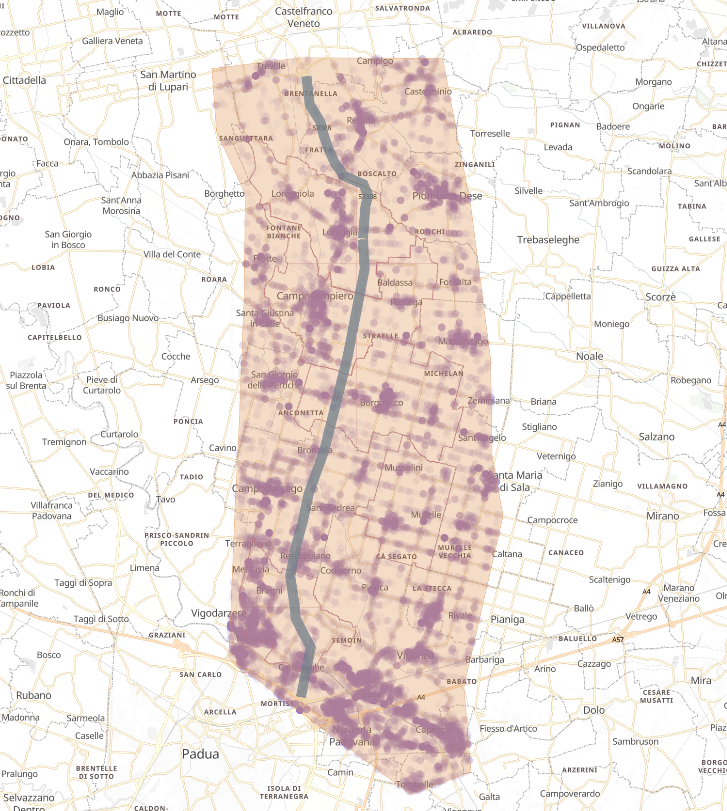 LUNGO SR 308 E VALSUGANA IL MOTORE DELL’INDUSTRIA PADOVANA. Nei due corridoi lungo e attorno al tracciato della nuova Strada del Santo SR 308 (perimetro di circa 70 km che copre un’area di ca 275 km2) e della 47 Valsugana (perimetro di circa 60 km e un’area di ca 190 km2) – rispettivamente, da Padova Est verso Castelfranco, e tra Limena e Cittadella – sono insediate complessivamente, al 31.12.2025, 7.037 unità locali di industria e costruzioni, pari al 25% dell’intero comparto provinciale, che occupano 77.849 addetti, pari al 28,9% degli occupati nell’industria padovana, con una dinamica di aumento del +83% rispetto al 2019 (35.293 addetti in più). Il tessuto produttivo insediato nelle due aree ha generato nel 2024 un valore della produzione industriale pari a 13 miliardi di euro, equivalenti al 38,2% del valore della produzione manifatturiera dell’intera provincia di Padova (oltre 34 miliardi di euro), con un aumento del +47% rispetto al 2019. Il fatturato di industria e costruzioni è stato di circa 12,8 miliardi di euro nel 2024 (+46% rispetto al pre-Covid), pari a circa il 38% dell’intero fatturato manifatturiero provinciale (oltre 33,6 miliardi). Nell’ambito di tutti i settori economici, le imprese operanti nelle aree lungo e attorno al tracciato di SR 308 e Valsugana hanno generato nel 2024 un valore complessivo della produzione pari a 18,3 miliardi di euro (28,5% del totale provinciale). (Fonte: InfoCamere per Confindustria Veneto Est).